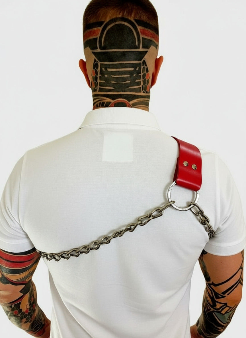 Orange Asymmetrical Leather Harness with Signature Medallion Genuine leather harness in vibrant orange with a polished signature medallion. Wide-cut straps create a bold silhouette, while precision hardware and luxury finishes deliver premium craftsmanship. A statement piece designed to stand out.