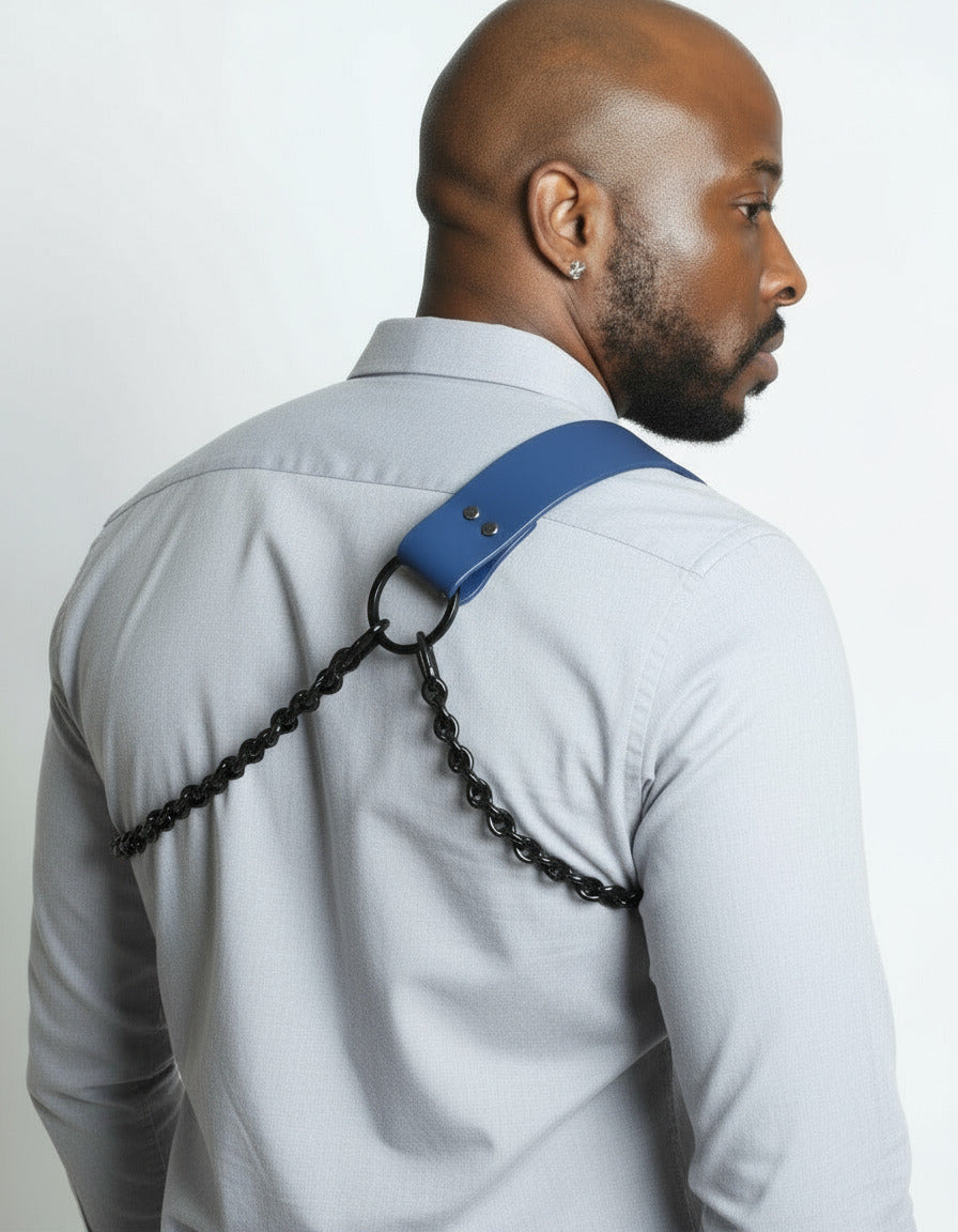 Blue Asymmetrical Leather Harness with Signature Medallion Genuine leather harness in vibrant orange with a polished signature medallion. Wide-cut straps create a bold silhouette, while precision hardware and luxury finishes deliver premium craftsmanship. A statement piece designed to stand out.