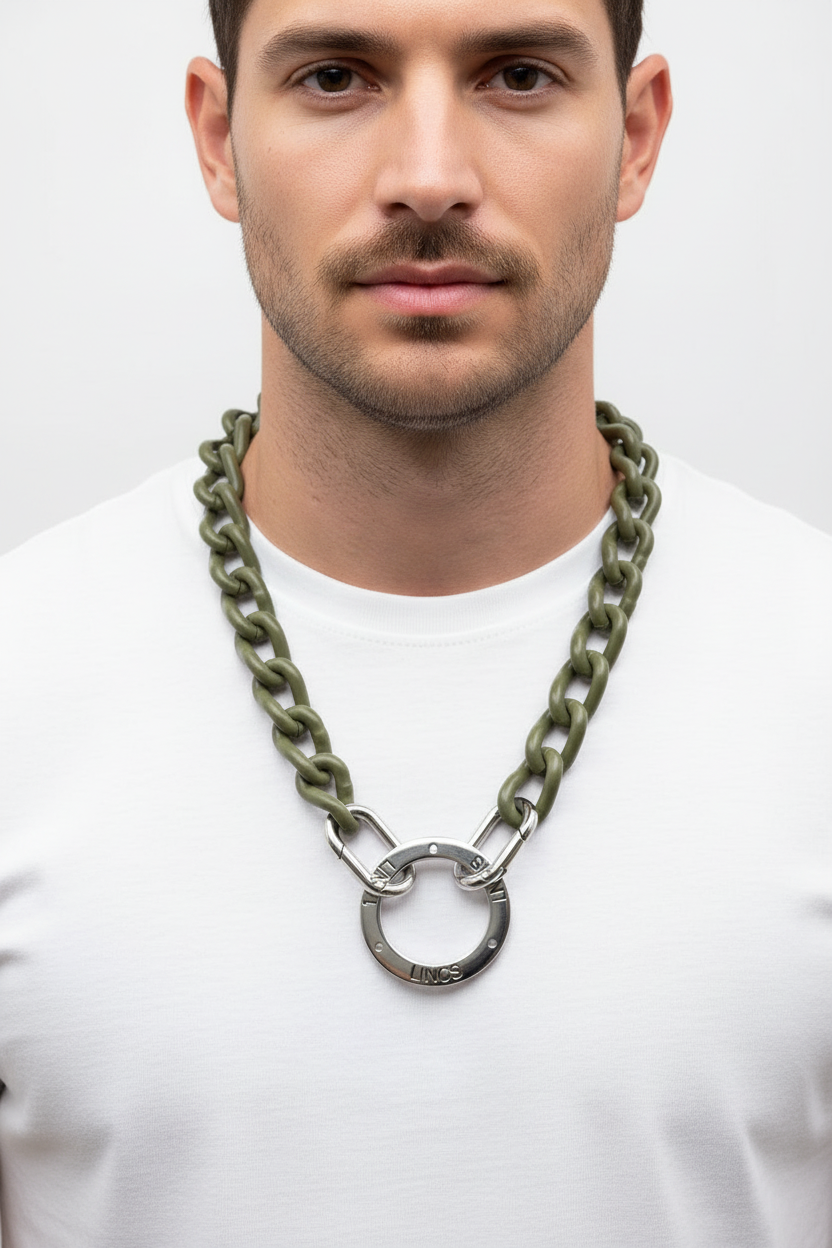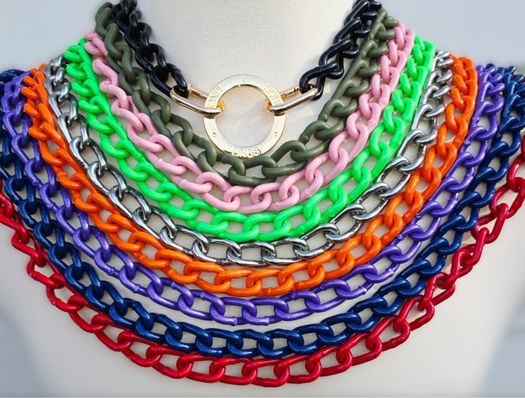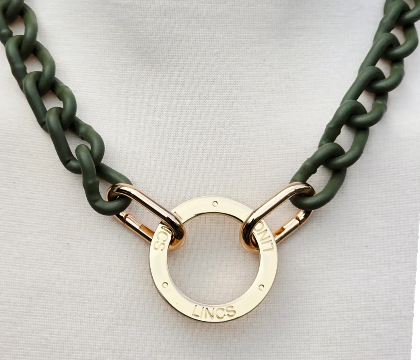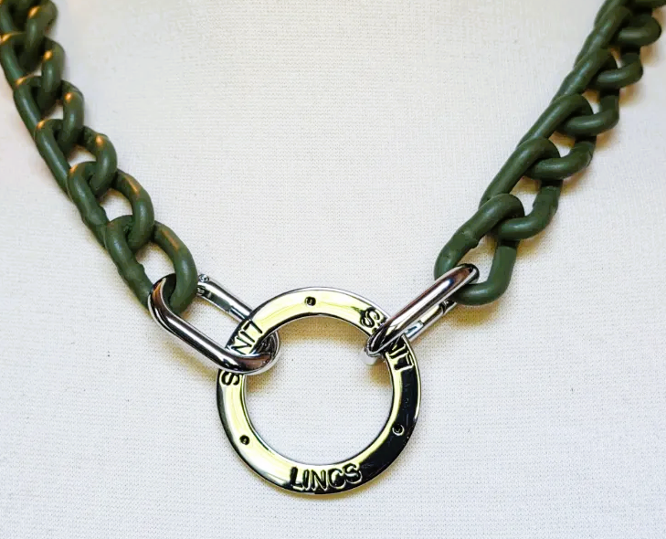 This bold statement necklace features an oversized chain paired with a striking O-ring centerpiece engraved with the Lincs name. The refined engraving and modern, edgy design are enhanced by the colored chain links, which contrast beautifully with the polished metallic ring.  Perfect for elevating both casual and upscale looks, this piece delivers confident, fashion-forward style. Available in four lengths—16", 18", 20", and 22"—with 16 curated colors including