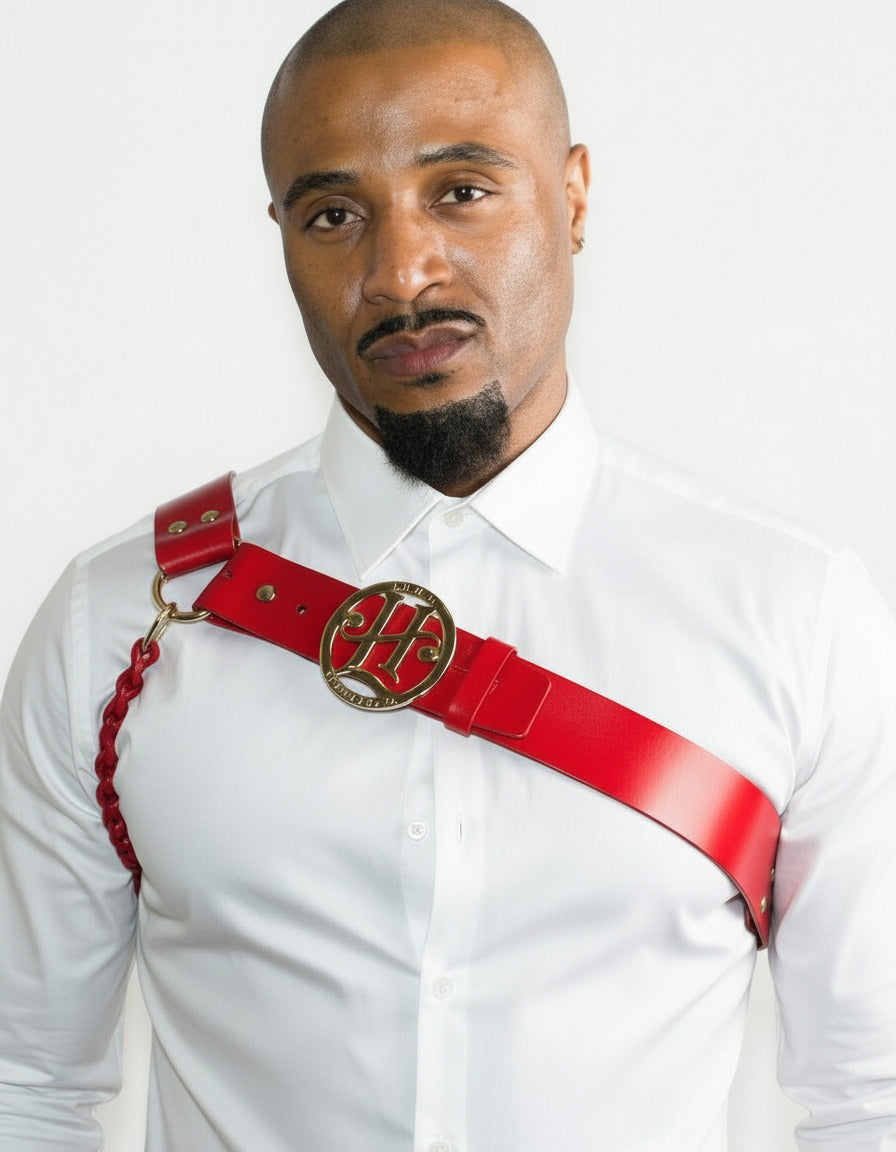 Red Asymmetrical Leather Harness with Signature Medallion Genuine leather harness in vibrant orange with a polished signature medallion. Wide-cut straps create a bold silhouette, while precision hardware and luxury finishes deliver premium craftsmanship. A statement piece designed to stand out.