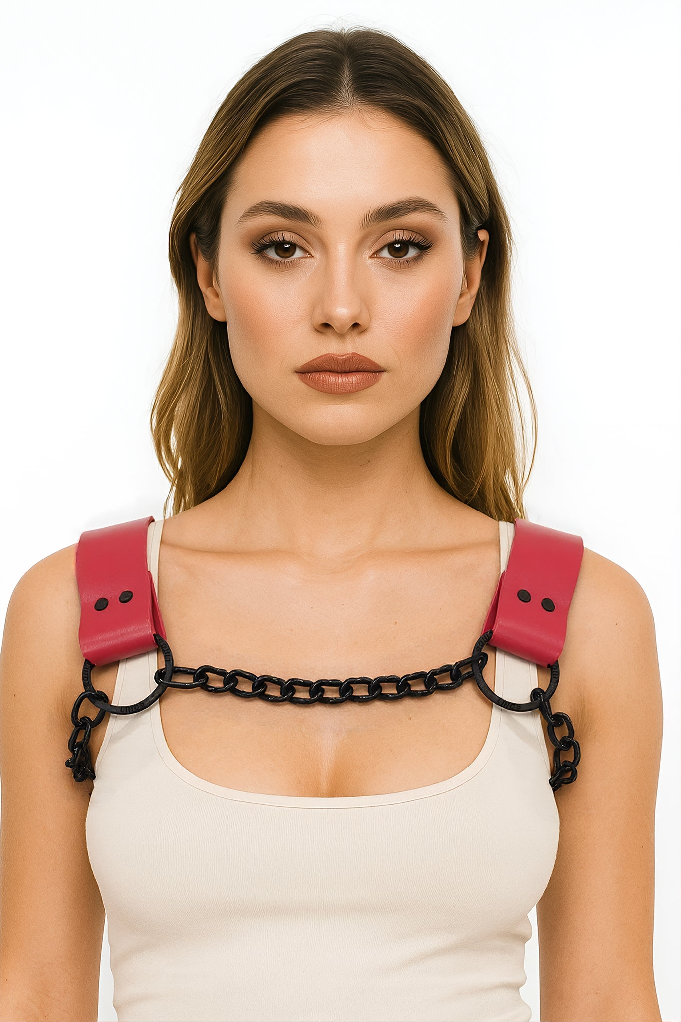 Elevate your look with the Red Leather Dogwood Overlay, crafted from premium genuine leather and accented with bold black powder-coated chains. Designed for both style and strength, this piece features sleek black hardware for secure, long-lasting wear. Durable enough for everyday adventures yet striking enough to stand out, it’s the perfect upgrade to your gear.