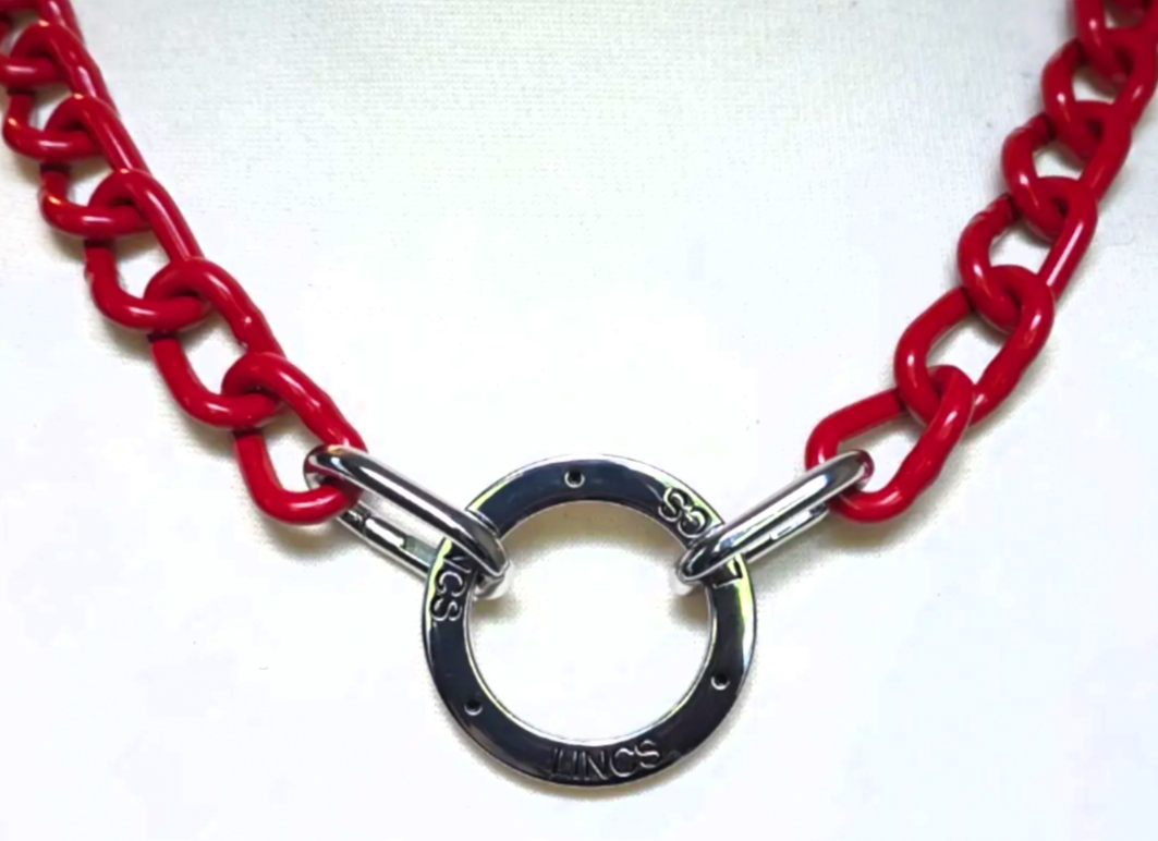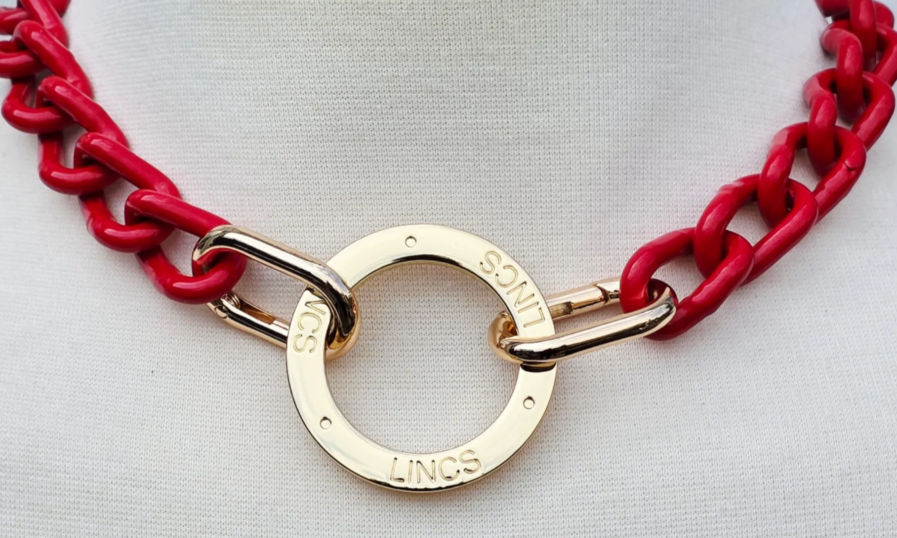 This bold statement necklace features an oversized chain paired with a striking O-ring centerpiece engraved with the Lincs name. The refined engraving and modern, edgy design are enhanced by the colored chain links, which contrast beautifully with the polished metallic ring.  Perfect for elevating both casual and upscale looks, this piece delivers confident, fashion-forward style. Available in four lengths—16", 18", 20", and 22"—with 16 curated colors including
