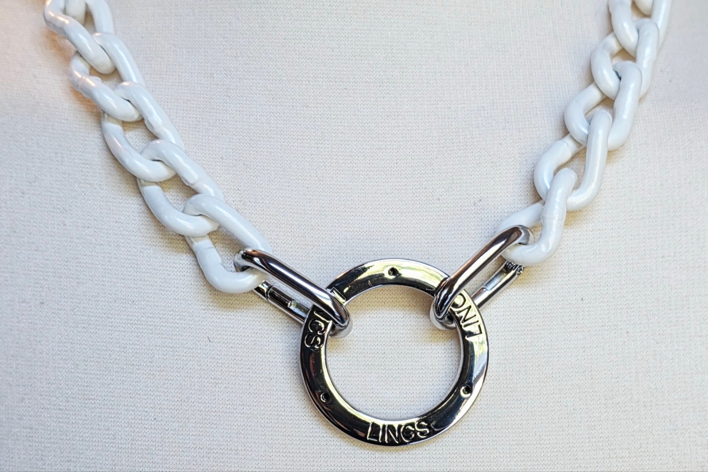 This bold statement necklace features an oversized chain paired with a striking O-ring centerpiece engraved with the Lincs name. The refined engraving and modern, edgy design are enhanced by the colored chain links, which contrast beautifully with the polished metallic ring.  Perfect for elevating both casual and upscale looks, this piece delivers confident, fashion-forward style. Available in four lengths—16", 18", 20", and 22"—with 16 curated colors including